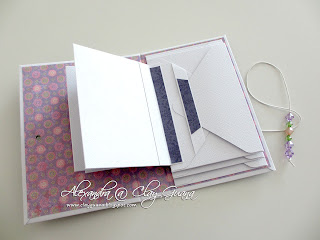 Inside the book there are 9 plain white envelopes of different sizes. I decided not to cover them with any patterned paper, but only to add violet strips in order to "connect" them to the notebook cover.