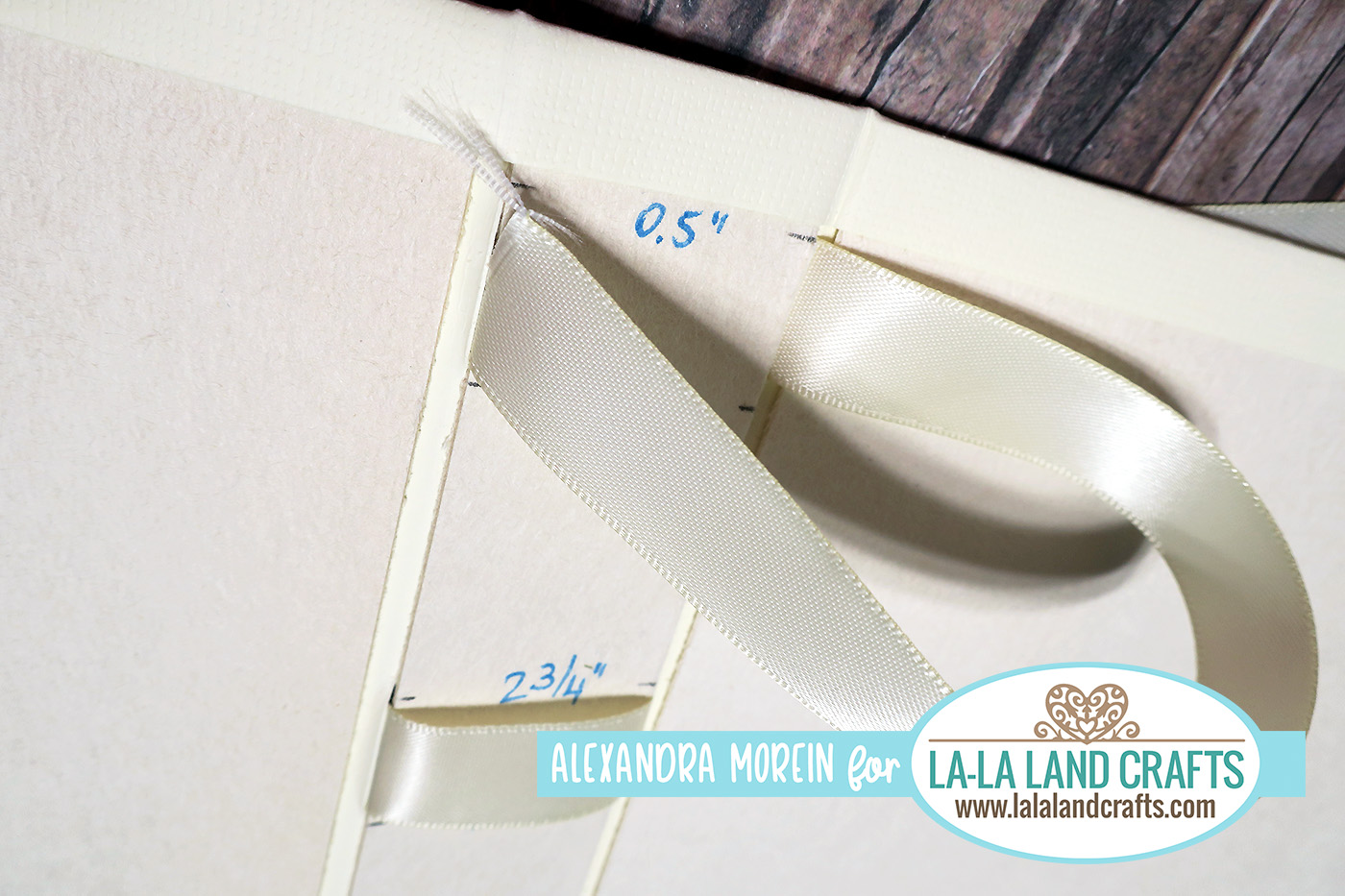 Anyway, we will make a few cuts next to the spine of the album cover, for sliding the ribbon through. I will be using 5/8" wide ribbon. It you plan to use a narrower ribbon or alternatively a wider one, please change the measurements accordingly.