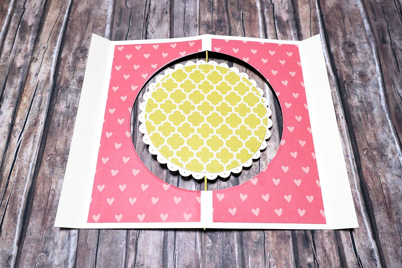 The paper piece that you cut out from the patterned paper will be used for matting the central area of the window pocket. Align in the center using the guide lines that you created before and glue down: