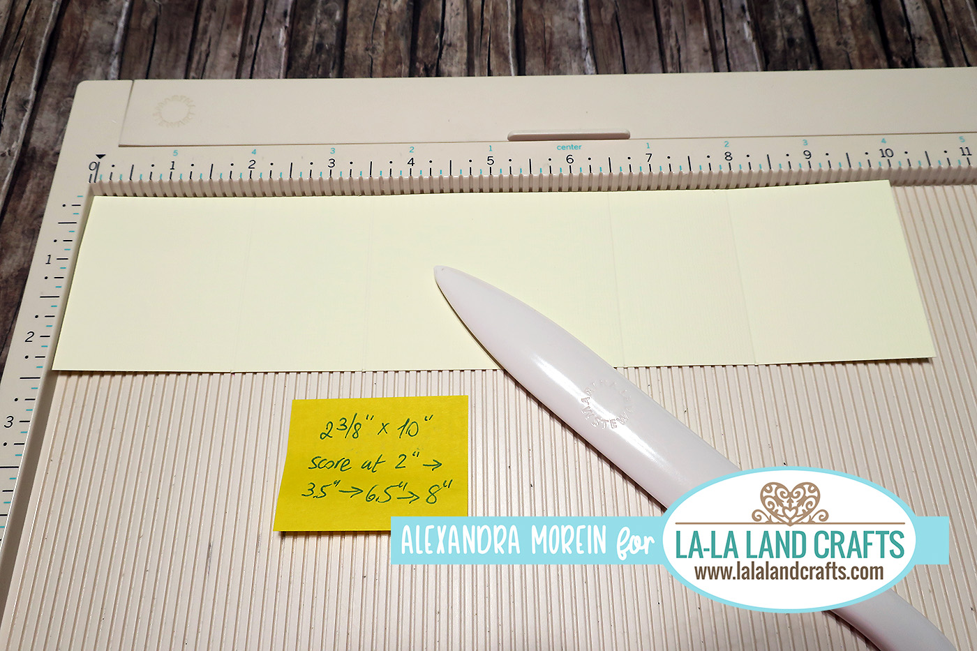 Prepare another paper pieces measuring 2 3/8" X 10". Score at 2" >> 3.5" >> 6.5" >> 8" on the long side:
