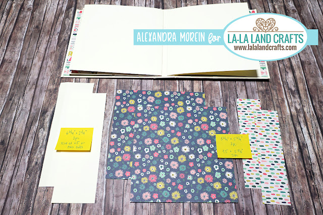 The next set of pages will have s spinner in between. Let's begin with preparing two pieces of patterned paper measuring 2 1/4" X 4.5" and a piece of cardstock measuring 6" X 4 3/4". Score this piece at 0.5" > 3" > 5.5" on the long side.