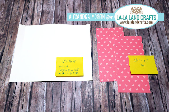 Prepare two pieces of patterned paper measuring and two pieces of cardstock measuring 5 3/4" X 5 3/4", two pieces of cardstock measuring 6 3/4" X 2 1/4" (scored at 0.5 on one short and one long side), and two pieces of patterned paper measuring 1.5" X 5 5/8".