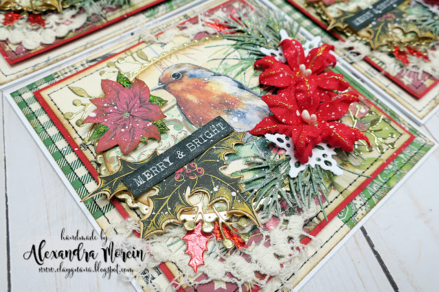 Here are some cards that I created for my friends. I used the digital papers from the Love Junk Journals on Etsy, as well as some of the dies from Tim Holtz and La-La Land Crafts. My absolute favorite die of the season was Layered Poinsettia Die. The fabric flowers on my cards were handmade using this stunning die.